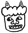 「大工とおにろく」を読み終わると「おにこわいよーきらいだ」と言う。「でもやさしい鬼もいるんじゃない、こんな色の鬼はどう?」とピンクの包装紙を見せると「うん、かわいいの作る」と言い出した。青、緑、ピンクと各自好きなのを選んだ。ボール紙で顔を四角、丸、細長と好きなように切る。ちぎった包装紙をのりで貼る。とても根気のいる作業だ。「これでいい?」「まだ白いところあるよ」と言われ、また一生懸命やる。目、口も切ってマジックで染める。顔はヒバ、角はカシの枝にするため山に取りに行く。「静かにそーっと行かないとお獅子がでるかもよー」と小正月のお獅子を思い出す子どもたち。枝を持ち帰り、お面につけた。みんなは「オニだぞー」と恐そうな声で園庭を走りだした。自然物を使ったお面は「とてもいい」と家庭から通信があった。