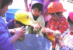 < 道路を渡り、みんなで買って来た種。